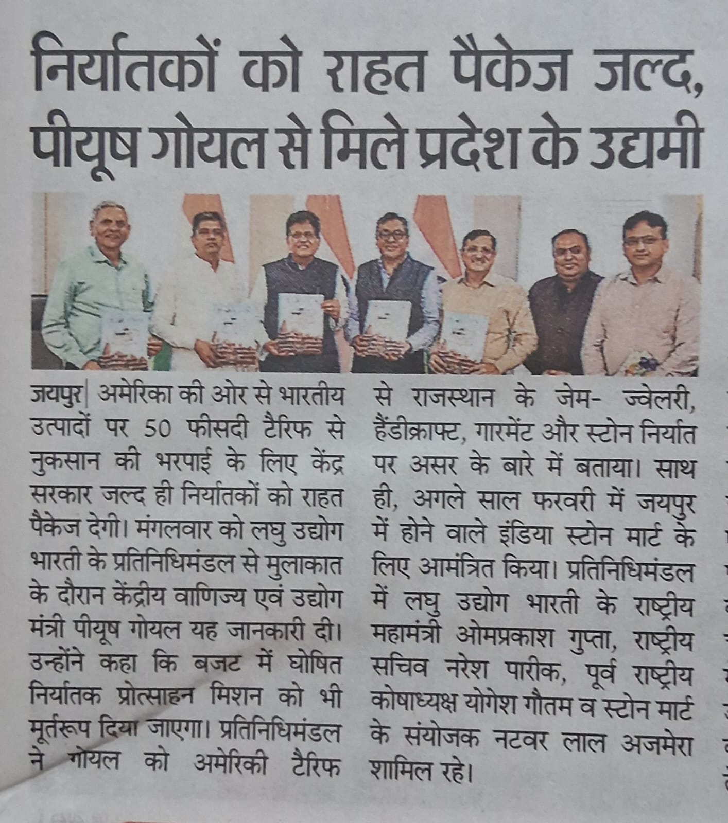 The delegation underscored the heavy losses being faced by exporters in Rajasthan’s gems & jewelry, handicrafts, garment, and stone sectors due to steep tariffs. Minister Goyal assured that the Central Government is actively working on a relief package to address these challenges. He further highlighted initiatives under the Export Promotion Mission, aimed at strengthening India’s presence in global markets and enabling MSMEs to access new opportunities.